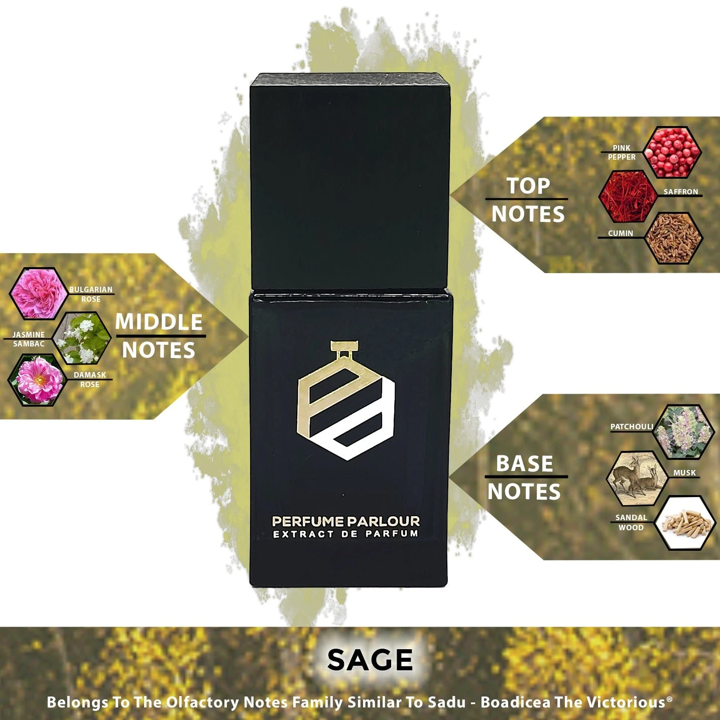 Pink Pepper, Cumin, Water Notes, Saffron and Ambrette (Musk Mallow)